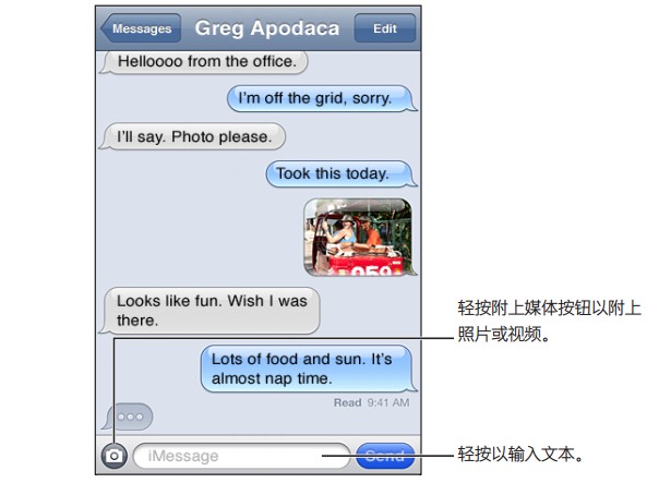 4. 若給運行 iOS 5以上的其他 iPhone、iPad和 iPod touch 用戶發送 iMessage 信息,用戶可輸入對方 Apple ID,如果對方的手機號碼也使用了iMessage功能,系統會自動將文本信息轉換為iMessage發送,並以藍色信息框顯示。