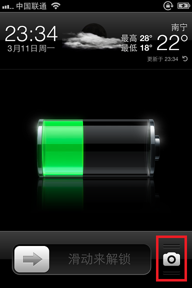另外,iOS 5 以上的系統支持用戶在鎖屏界面上直接輕按相機鍵拍照。操作方法是按住相機圖標向上拖拽。