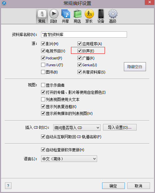 勾選“鈴聲”,確定,便可在左側資料庫中看見“鈴聲”。