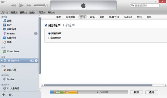 將 iPhone 設備連接 iTunes,點擊設備,找到鈴聲選項卡,選擇“所有鈴聲”,點擊“應用”,同步完成後即完成了鈴聲文件的添加。
