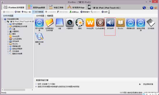 將 iPhone 連接電腦後打開 iFunbox 程序,選擇“已經連接的設備中”的“手機鈴聲”