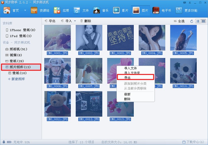 切到設備底下的照相機,選中要導出的照片(ctrl+a全選),右鍵導出,或者直接拖曳出來。