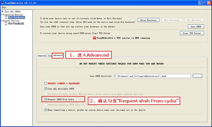 1.雙擊啟動小雨傘Tinyumbrella,進入advanced,確認已勾選Request SHSH from Cydia(默認是勾選的)