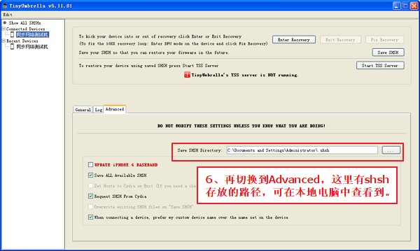 3、切換到advanced,可以找到存放shsh的本地路徑,C:Documents and SettingsAdministrator.shsh,在電腦上按此打開,就能看到備份的shsh文件了,可用來恢復老版本固件或者自制固件。