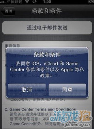 4、接下來會彈出是否同意ios、icloud及game cebter條款的框,點擊同意即可。