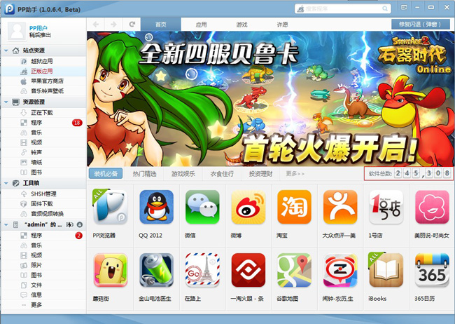 當然PP助手(Win)版最受用戶青睐的還是其在資源下載方面的優異表現,資源量豐富多樣,搜索方便快捷,下載速度逼近用戶帶寬上限。就資源量而言,目前,在PP助手(Win)版上架的越獄應用已經超過44萬,正版應用資源突破24萬,全部免費,且在持續不斷地更新上架中。對那些沒有越獄,特別是那些升級至iOS6.1.3後無法越獄且無法降級的用戶,PP助手(Win)版24萬免越獄免費下載安裝的應用游戲資源會給予他們很大的幫助。