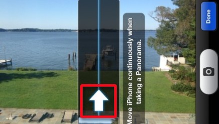 注:全景模式默認是從左向右拍攝,點擊下圖中紅框處的箭頭,則可從右向左拍攝;將iPhone手機橫放則可實現從上往下或從下往上拍攝照片。