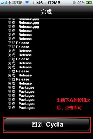 6.耐心等待,直到下方出現回到Cydia按鈕,才表示已經完成源的添加,點擊回到Cydia。
