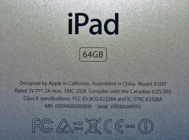 iPad 和 iPod touch 序列號都刻在背面外殼底部附近,如下面 iPad 上所示。MEID 和 IMEI 編號(如果適用)也刻在 iPad (Wi-Fi + 3G)、iPad 2 (Wi-Fi + 3G) 和 iPad (WLAN + Cellular) 的背面。