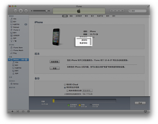 連接 iPhone 時,點按“電話號碼”以便循環顯示 MEID、IMEI(如果適用)及 ICCID 等其他設備信息。