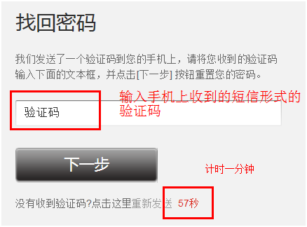 5、 系統會馬上推送一個驗證碼到該手機,在一分鐘內將收到的驗證碼輸入下面的文本框,並點擊下一步開始重置密碼;