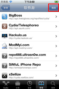 1)打開iPhone上的Cydia程序,等待它載入數據之後,點擊下方的“管理”,如下圖紅圈所示: