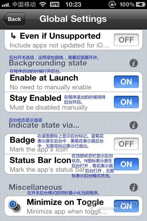 Stay Enabled表示是否要在程序最小化的時候保持後台開啟,這個選項相當蛋疼,因為如果不打開這一項,不管你在程序運行的時候切換到了什麼後台模式,一按Home鍵全部關閉。所以如果這一項關閉了,那麼Enable at Launch就沒有意義了,反正最小化的時候後台都得關閉。而且Minimize on Toggle關閉也沒有意義了,解釋起來實在費勁,你們懂的~~~這個選項需要關閉的唯一一種使用方式就是配合Enable at Launch關閉,Minimize on Toggle打開。在這種情況下,程序打開的時候後台總是關閉的,然後你短按Home鍵正常關閉程序,長按Home鍵(或者你自己設置的切換手勢)最小化程序到後台。如果你不是這種使用方式,那麼這一項應該一直保持打開。