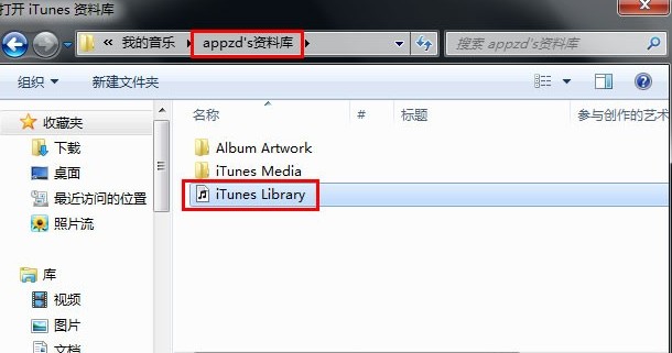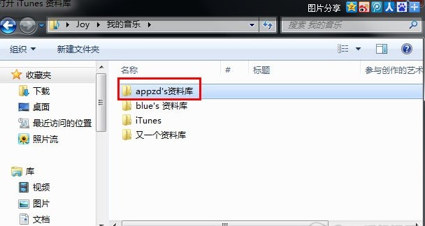 4.打開“appd’s資料庫”,雙擊此文件夾下“iTunes Library”選項,打開iTunes,就可以進行資料同步了