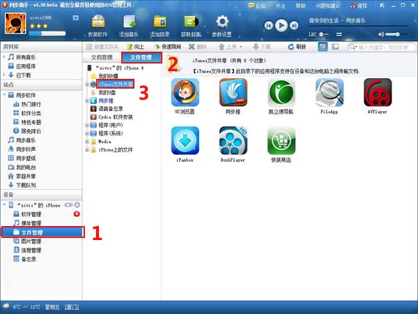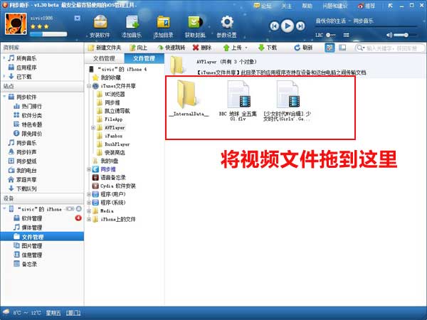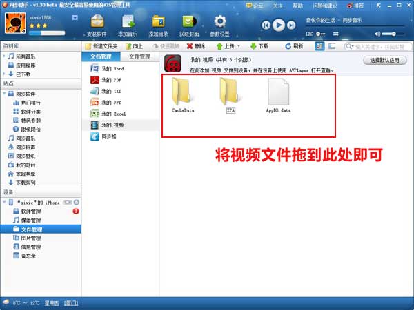 1.首先將你的設備連上同步助手,在設備的“文件管理”裡有個“我的視頻”,如果安裝了AVPlayer的同學就可以看到AVPlayer下的文件夾。