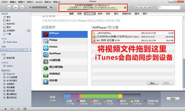 2.進入應用程序後,滾動條拉到底部的“文件共享”,點擊AVPlayer或者RushPlayer,跟前面操作相同,將視頻拖到這裡即可,iTunes會自動同步進iOS設備中。