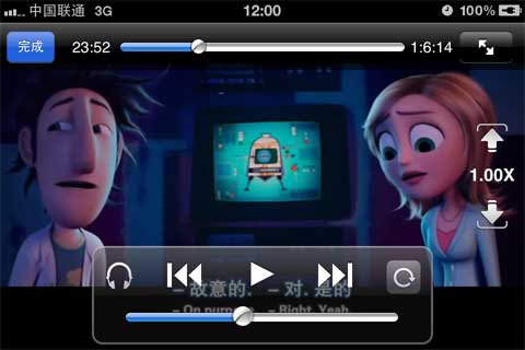點擊播放之後,可以看到AVPlayer的界面還是比較花哨的,但那些圖標只要單擊一下即可隱藏,在播放的時候可以快進、看下一首、查看影片信息、倍速播放、字幕開關、旋轉鎖定、調節色彩等功能。