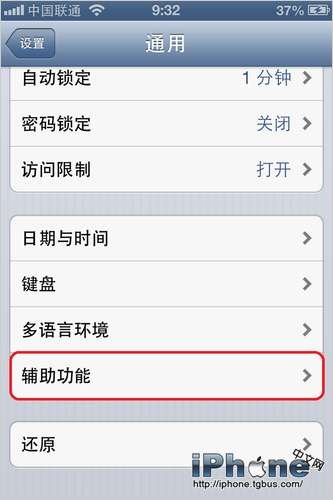 3、點擊打開“通用”,用手指向上滑動,找到“輔助功能”,如下圖紅框標注所示: