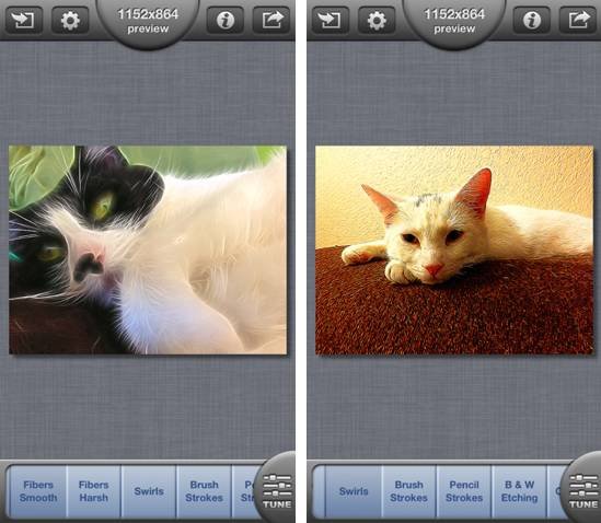 該應用提供纖維,漩渦,筆觸,銅版畫,以及網格這些效果。能實際運用是最好的,因為不同效果的好壞取決於用戶要修改的對象,你修改一幅人物照和一幅漂亮的風景照得出的效果是會有差異的。