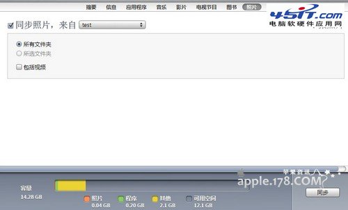 勾選同步照片,並且在後邊的下拉菜單中選擇自己想要同步的圖片。設備能默認播放的視頻也可以同時同步進去。