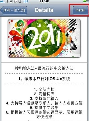 進到輸入法詳細說明界面,請確認你的固件是4.x以上。點擊右上角的“Install