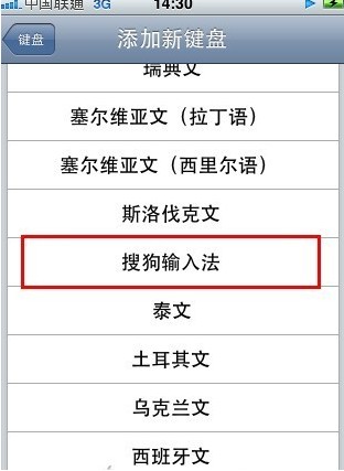 界面顯示你現在正使用的輸入法,點擊“添加新鍵盤...”在無數的語言中找到“搜狗輸入法”,耐心,它就在斯洛伐克與泰文中間...