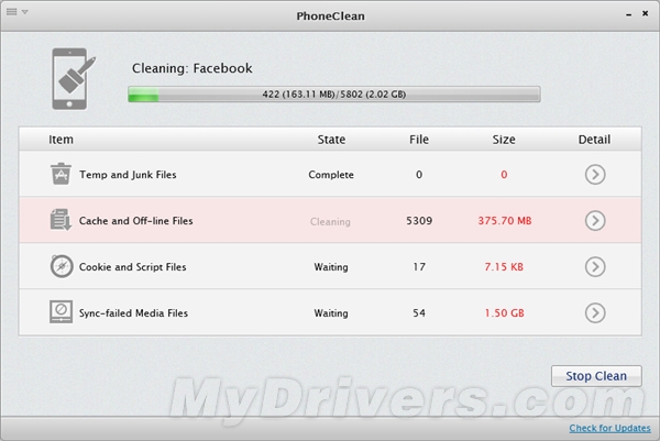 掃描結束顯示結果。點擊Detail可查看是哪些App產生的文件,選擇想要清除的文件並點擊“Start Clean”