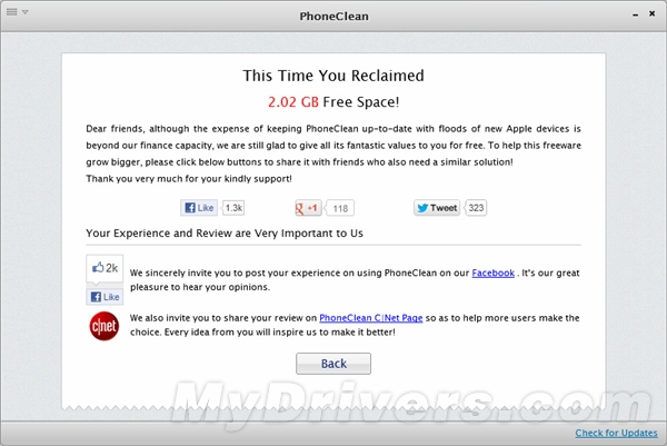 用USB數據線將iOS設備和電腦連接,Phoneclean顯示該設備的已用/可用空間,並讓你選擇想要清除的文件類別然後點擊“Start Scan”