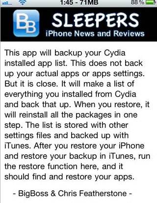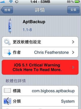 AptBackup 的原理是將你安裝過的Cydia App 清單及位置備份,但如果你的Cydia App 是「盜版」則不能備份那些程式。