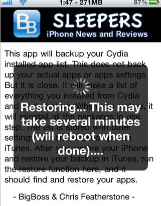 2.執行AptBackup按Restore即回從Cydia找回下載過的Cydia App。