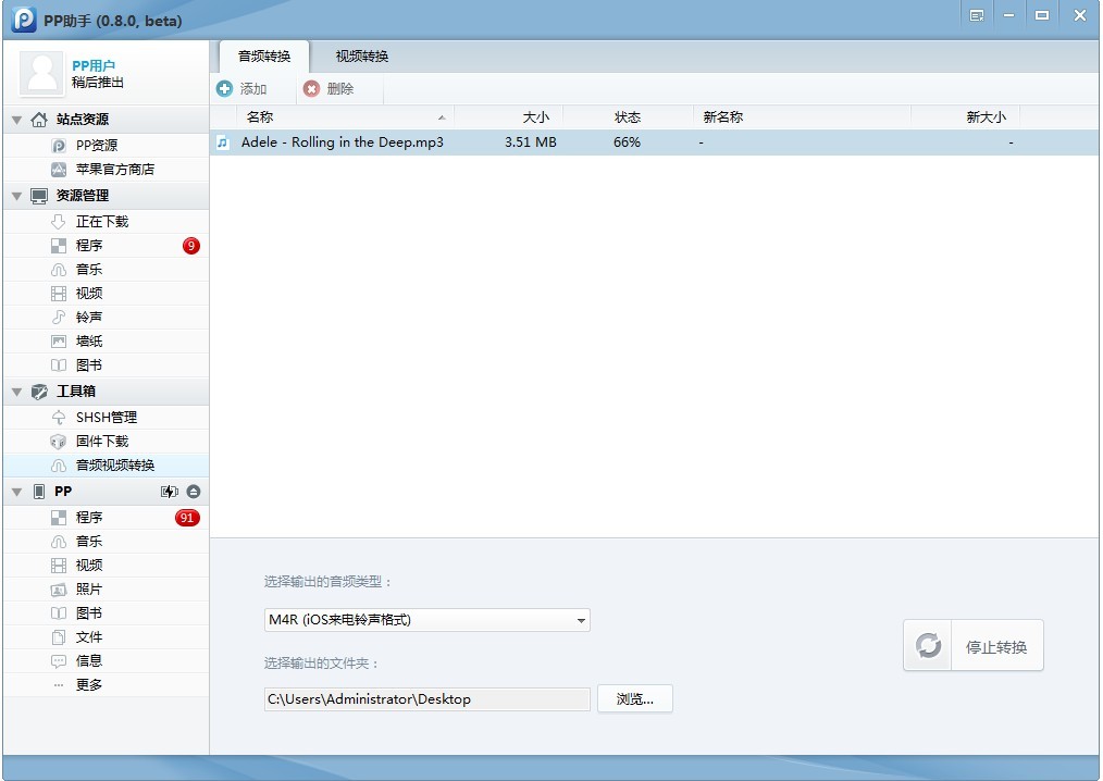 首先在電腦上打開你的PP助手,看見工具箱進入音頻視頻轉換就可以開始轉換了。