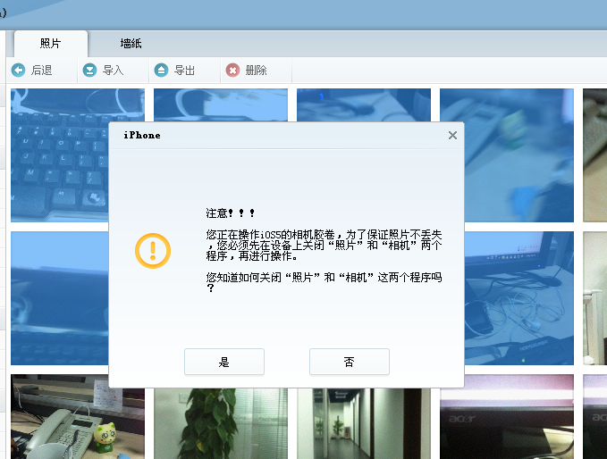 選擇照片導出,會有提示,不讓照片丟失請關閉手機上的—照片和相機—倆個程序。