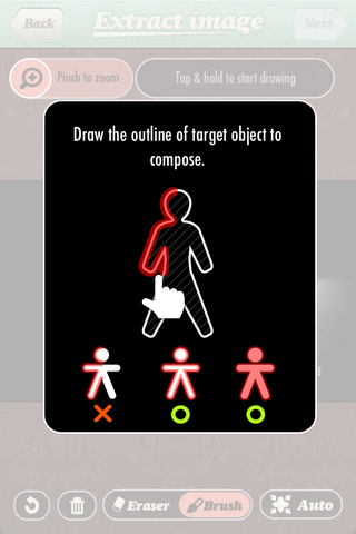 《Retromatic》 支持直接啟用鏡頭拍攝照片以及從現有圖片中導入,主要操作模式非常簡單,屏幕上都會有確切的提示訊息。當開始進入編輯模式時,先按住相片畫面不妨,等待從預覽模式換到畫筆模式,就會出現筆畫痕跡,將想要表達的主題圈起來。橡皮擦可以擦去畫筆的痕跡,改正選區范圍,或者利用擦除來做出一點破損做舊的效果。