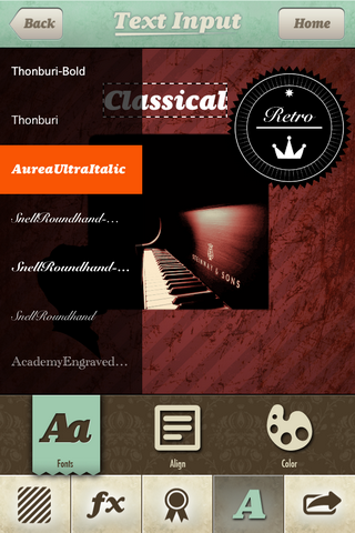 在海報的正上方可以輸入簡短的介紹文字或者標題,增加一點文藝效果。支持的字體種類很多,但是輸入時候中文鍵盤還有其他某些鍵盤會擋住功能框,用戶點擊不到確定和取消按鍵,還要切換成英文鍵盤才能確定。另外注意對效果不滿意的時候可以用返回清除,但是會回到最開始的編輯界面,剛才所做的應用完全不保留。
