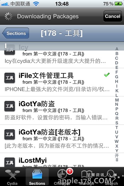 這個時候我們需要安裝一個iFile,178源-178工具-iFile文件管理工具。若沒添加178源請添加 http://apt.178.com。在源中找到iFile並安裝。
