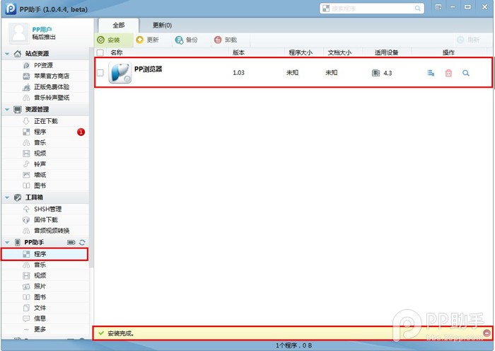 6.打開“資源管理”區的“程序”項,找到剛下載好應用程序點擊“安裝”,即可安裝到成功連接PP助手的iOS設備;