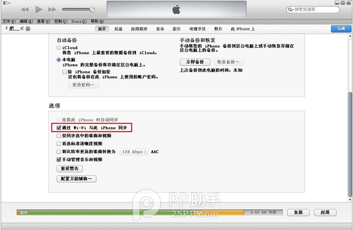第三步:在iTunes界面底部勾選“通過Wi-Fi與 此 iPhone 同步”並點擊界面右上角“完成”;(完成這一步就可以將數據線拔掉了)