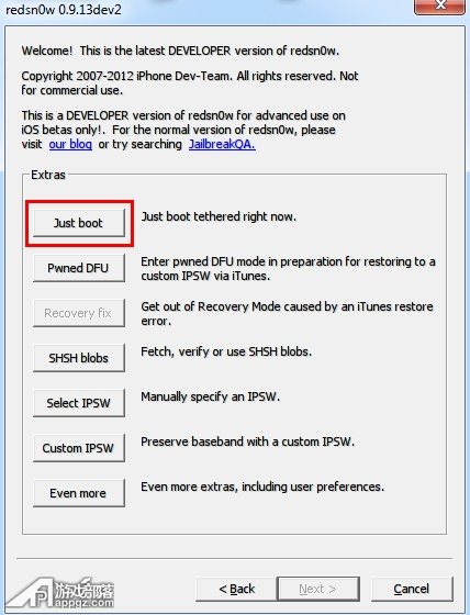 6、再次打開紅雪,然後依次點擊“Extras(其它)”、“(Just boot)引導啟動”。然後按照屏幕提示進行操作即可完成引導啟動。不完美越獄完成!