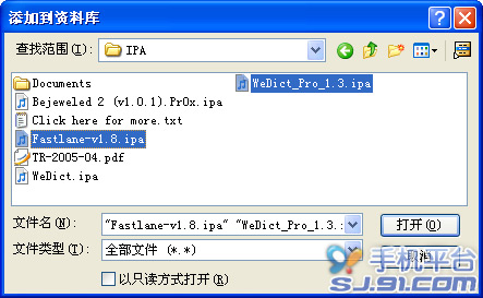 3. 筆者在這裡選擇的是“將文件添加到資料庫”這個選項,在彈出的文件選取對話框中,可以安裝鍵盤上的ctrl鍵或者shift鍵來選中一個或多個的應用程序文件。選中後,點擊“確定”按鈕,即可將文件導入到iTunes應用程序資料庫中。