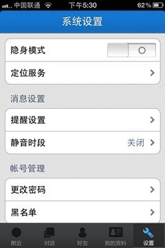 設置是否隱身,以及開啟位服務,消息設置,帳號管理等。