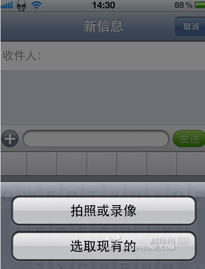 先打開iPhone4S上的信息應用,然後點擊右下角寫新短信的按鍵進入寫短信的界面,然後點短信輸入框左側的照相機的圖標,接著在彈出的選項裡選“拍照或錄像”進入相機界面。