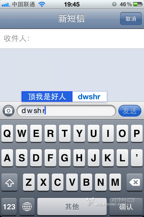 現在拿起你的手機,打“頂我是好人”這幾個字,和我下圖對比!!咦??為什麼5個字母“dwshr”就可以了?呵呵,iphone可以自定義詞組的:設置->通用->鍵盤->編輯用戶詞典,設置好後,這樣輸入“怎麼了(zml)”,“吃飯了嗎(cflm)”等自定義詞組方便多了!!效率是大大大提高了, 哈哈哈哈