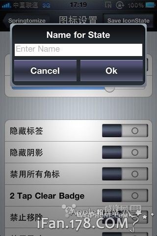 這一大類的設置和其他的有些不同,從上面的圖片中可以看到,在圖標選項的界面中的右上角有”Save IconState“這個按鈕,你可以將你現在的圖標設置存儲下來做為一個方案以便以後使用。點擊該按鈕後出現如下畫面: