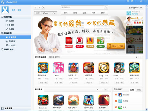 iTools助手也是一款簡單易用的管理軟件,但是沒有自家的資源,采用的是91助手的開放資源,資源上沒有形成優勢。不過新近開設“CNTV”專欄,提供網絡電視客戶端集群應用,方便用戶下載,還是吸引一定的人氣。