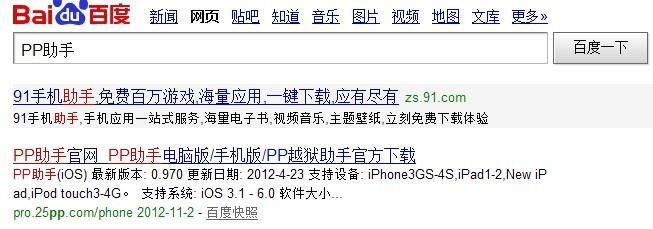 從上面2012年10月至11月的熱點趨勢來看,PP助手的用戶關注度漸有超越91助手的趨勢,而同步推則漸漸走向下坡。看來後起之秀PP助手有著不容小觑的趨勢。這不得不又再次提到,筆者之前百度搜索的結果,91助手竟然是購買了“PP助手”關鍵詞百度競價推廣, 而PP助手居然排在第二位。(有圖為證)這無疑是91助手作出的不良竟爭行為。