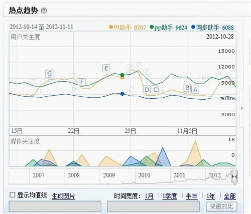 從筆者利用查詢工具可以看出來,從2012年10月14日至今用戶關注度PP助手有9624,而91助手有9207,同步助手僅達到6088,看來PP助手從上線至今在用戶關注度方面已經趕超91助手,一躍成為最受歡迎的蘋果管理軟件。