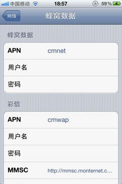 b、“彩信”設置組裡的“APN”填cmwap ;“MMSC”填入http://mmsc.monternet.com。