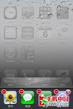 作為智能手機,iOS擁有海量的應用可供用戶下載安裝。當用戶需要排列應用順序時,只需按住任意的圖標,所有的應用就會抖動起來,這時用戶只需長按住任意的圖標就可以進行拖動操作,用戶自行安裝的應用左上角會出現一個灰色的小叉子,點擊小叉子就會提示是否刪除該應用。iOS還支持文件夾管理,用戶只需將任意兩個圖標摞在一起,就會彈出文件夾的提示,免去了用戶自行建立的操作,非常人性化。
