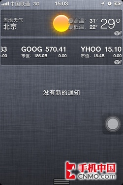 iOS 5還加入了下拉菜單的功能,用戶用手指從最上端往下滑動的時候,屏幕就會像拉抽屜一樣彈出一個灰色的菜單,在這裡非常方便的顯示了當地的天氣情況和股市行情,還會更加詳細的顯示出用戶錯過的來電和信息詳情。當用戶在主屏幕單擊HOME鍵或者將屏幕向右拖動,手機便會顯示如上面右側圖顯示的搜索界面。在這裡,用戶可以輕易的搜索到所需的短信、郵件、聯系人等,免去了自行搜索的煩惱,此外,這個搜索菜單還可以即時聯網搜索資訊。