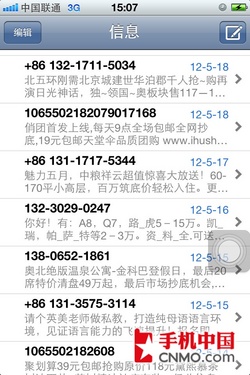 蘋果iOS在短信輸入方面與上代產品沒有太多區別, 依舊支持Qwerty鍵盤,數字鍵和手寫輸入法。用戶如果需要創建新信息,只需單擊屏幕右上角的按鍵即可跳到短信輸入界面。當用戶需要刪除信息時,只需在信息上輕輕橫向滑動,右側就會出現刪除的提示,如果用戶需要批量刪除,就點擊屏幕左上角的編輯圖標,每條信息左側就會有紅色的提示,選擇完畢後點右上角的紅色刪除按鍵即可。